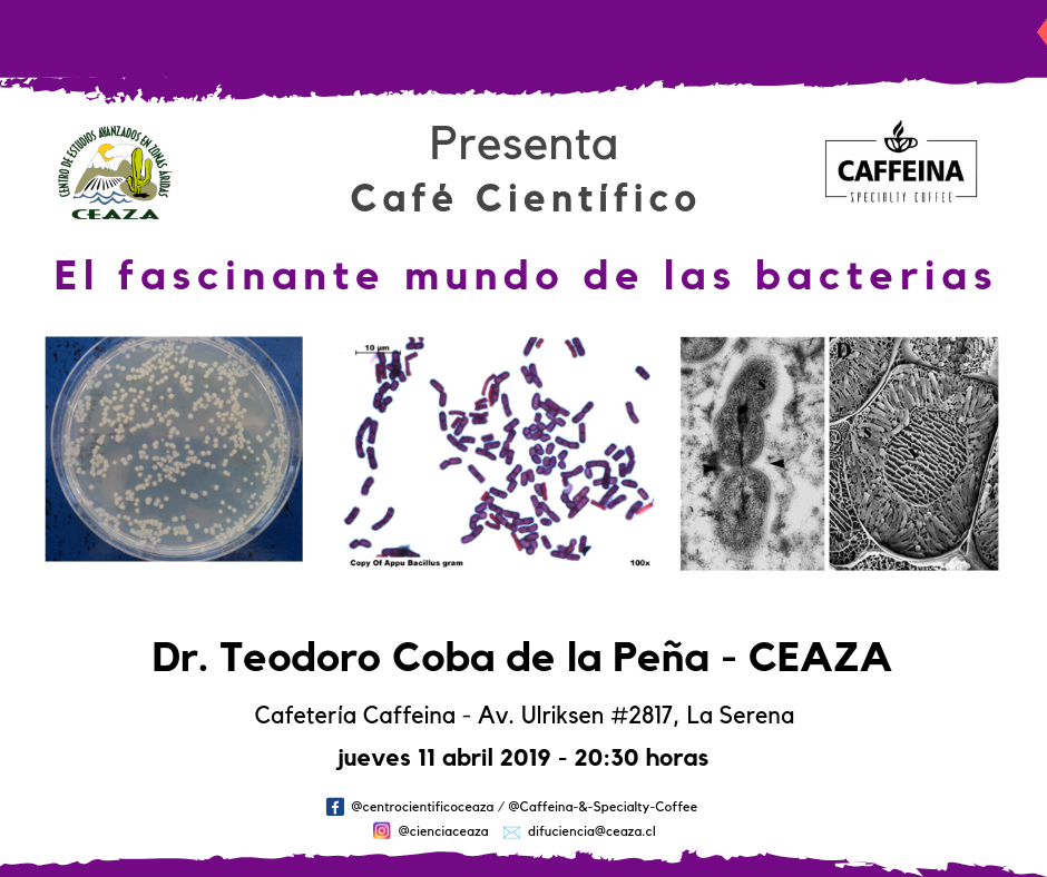 Este jueves 11 de abril, a las 20.30 horas se desarrollará una nueva versión del café científico del centro científico CEAZA, en la cafetería Caffeina de Ulriksen 2817, La Serena. En esta oportunidad la charla será “El fascinante mundo de las bacterias”, a cargo del Dr. Teodoro Coba de La Peña, investigador del mismo CEAZA.