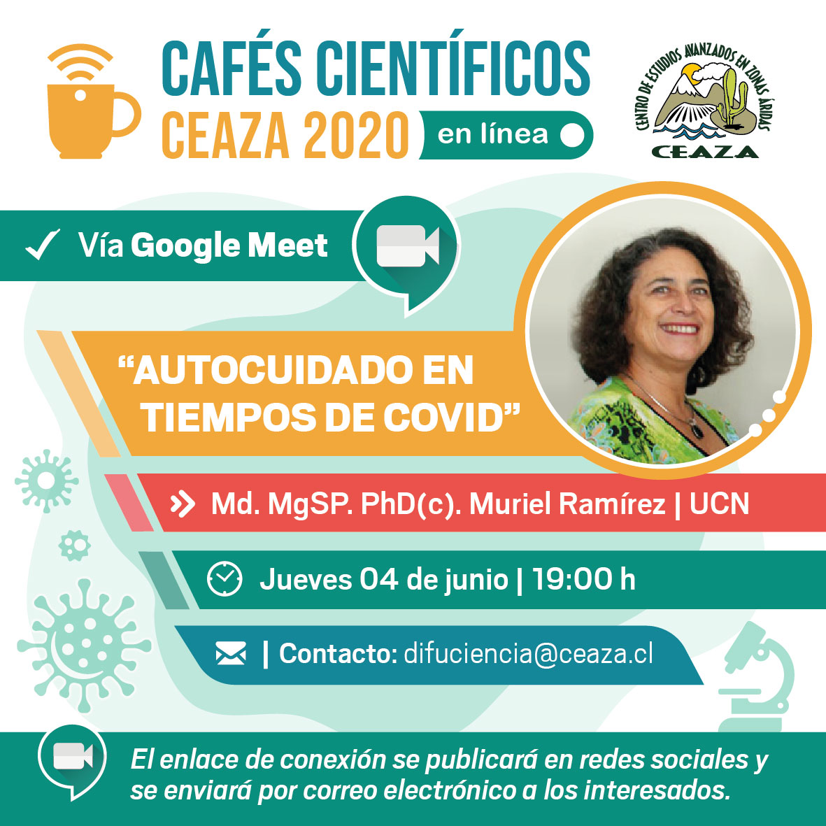 El primer café presentará el tema “Autocuidado en tiempos de COVID”, a cargo de la Dra. Muriel Ramírez, epidemióloga de la Universidad Católica del Norte.