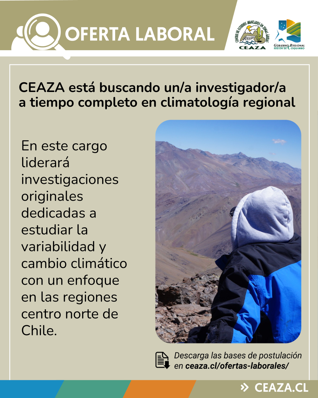 El/La investigador/a en climatología regional liderará investigaciones originales dedicadas a estudiar la variabilidad y cambio climático con un enfoque en las regiones centro norte de Chile. Mediante la integración del modelado numérico, técnicas estadísticas y/o de inteligencia artificial con datos de observaciones locales, el/la investigador/a avanzará en la comprensión de los procesos climáticos y físicos a escalas local y regional, así como sus vinculaciones con forzantes globales. Entre otros, las líneas de investigación pueden incluir: clima de montañas, interacciones entre la superficie terrestre, el mar y la atmosfera, eventos hidrometeorológicos y térmicos extremos y sus precursores, fuentes de predictibilidad a escala regional, cuantificación de incertidumbres, técnicas de downscaling y corrección de sesgos.