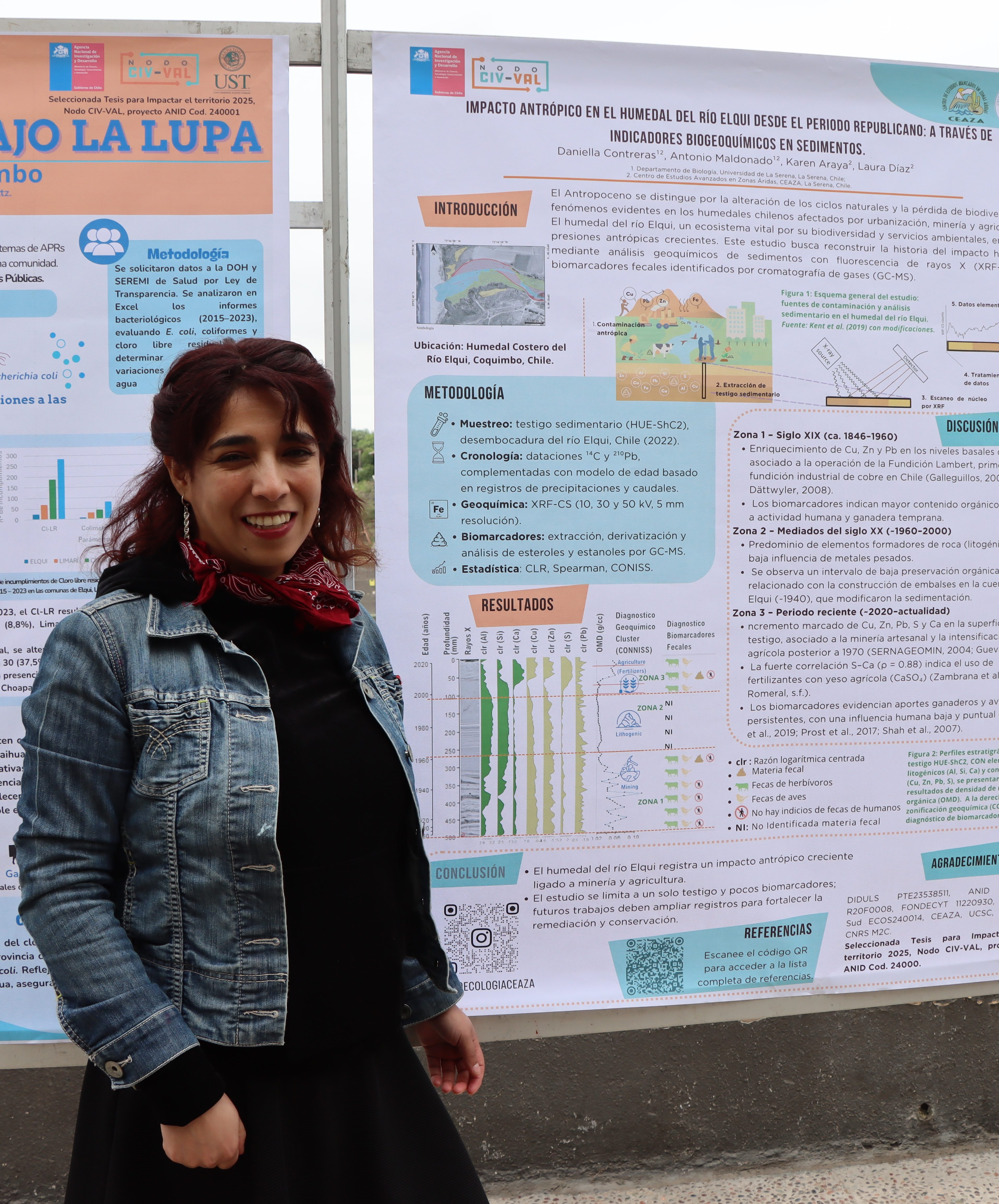 Otra tesis reconocida fue la de Daniela Contreras, del Laboratorio de Paleoclima de CEAZA, quien estudia el impacto histórico de la actividad humana en el humedal del río Elqui: “El estudio que realizamos busca entender cómo ha cambiado el humedal a lo largo del tiempo. Tomamos testigos sedimentarios que abarcan desde 1846 hasta la actualidad y pudimos observar distintos ciclos de impacto humano: primero por la minería, con la fundición Lambert en el siglo XIX, y luego por el crecimiento agrícola más reciente”, explicó.