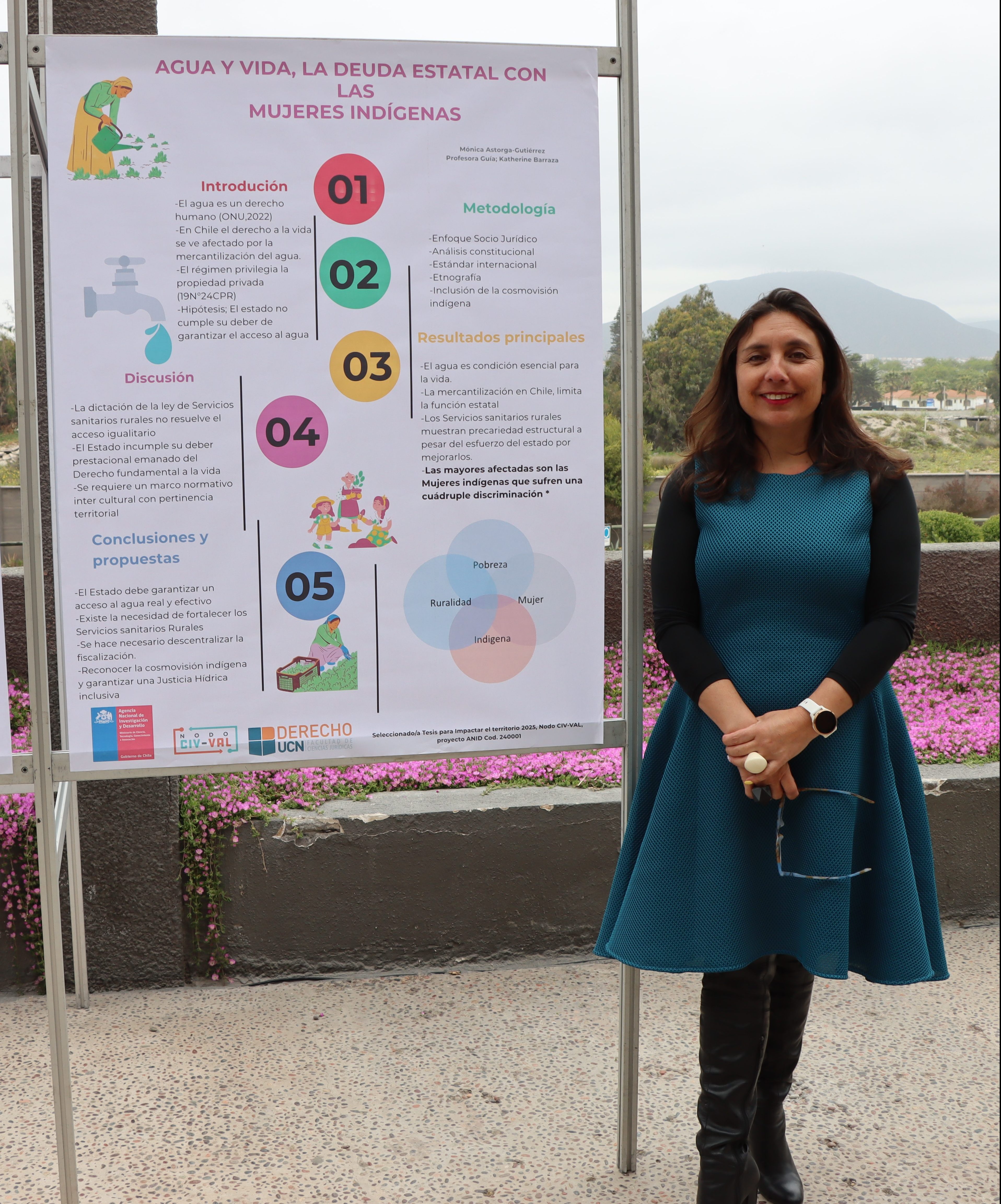 Entre las investigaciones destacadas dentro del programa “Tesis con impacto en el territorio” se encuentra la de  Mónica Astorga, abogada del CEAZA, quien desde el ámbito del derecho aborda el impacto de la falta de acceso al agua potable en zonas rurales, con especial énfasis en las mujeres y comunidades indígenas: “Lo que la tesis pretende es visibilizar la falta de cumplimiento de la obligación estatal respecto al derecho a la vida, concadenado con el derecho al acceso al agua potable, y poder visibilizar de alguna manera los efectos que la falta de acceso al agua potable tiene en las zonas rurales, en las mujeres, y sobre todo en aquellas mujeres que tienen la condición de indígenas, que son afectadas por una cuádruple discriminación”, explicó.