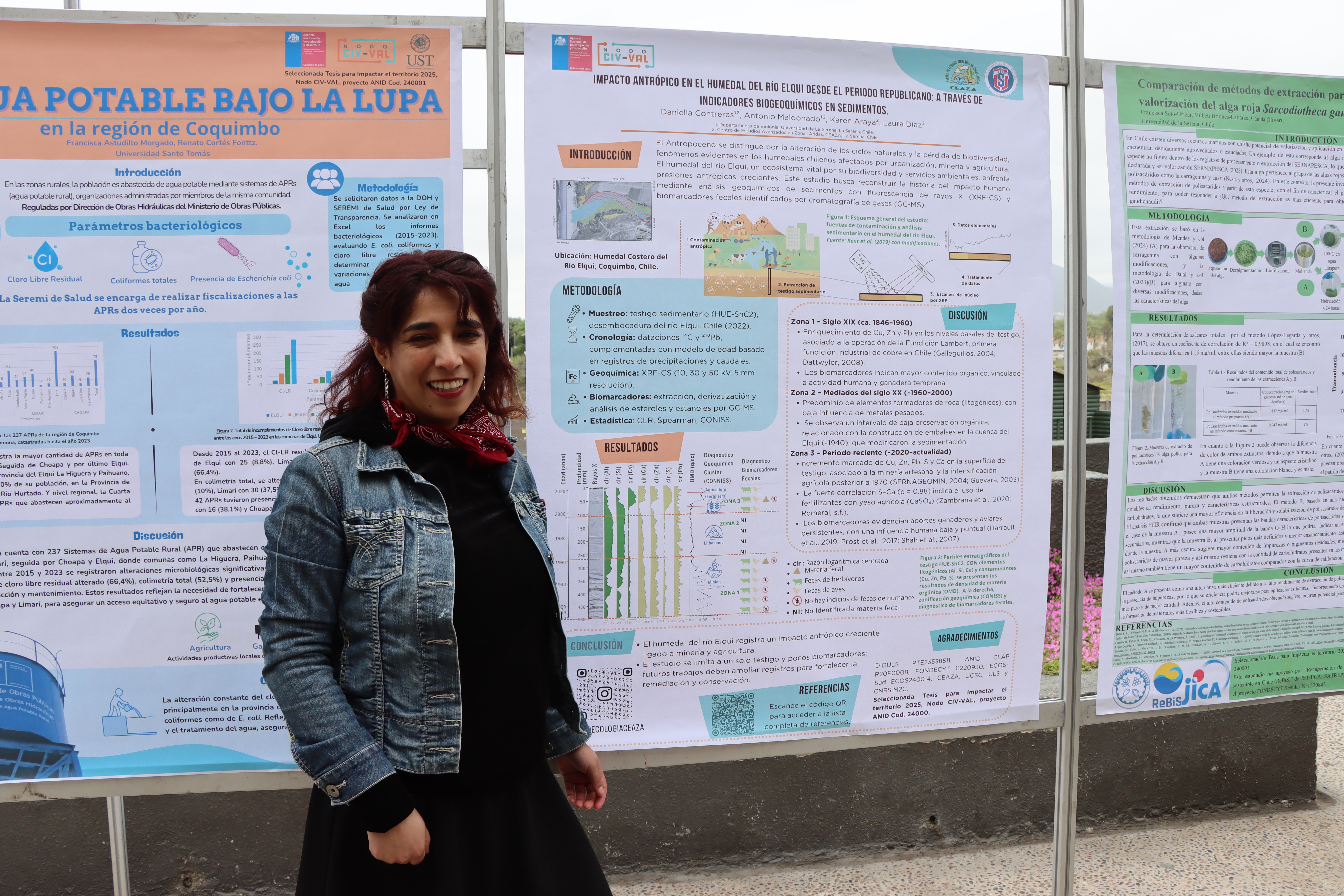 Otra tesis reconocida fue la de Daniela Contreras, del Laboratorio de Paleoclima de CEAZA, quien estudia el impacto histórico de la actividad humana en el humedal del río Elqui: “El estudio que realizamos busca entender cómo ha cambiado el humedal a lo largo del tiempo. Tomamos testigos sedimentarios que abarcan desde 1846 hasta la actualidad y pudimos observar distintos ciclos de impacto humano: primero por la minería, con la fundición Lambert en el siglo XIX, y luego por el crecimiento agrícola más reciente”, explicó.