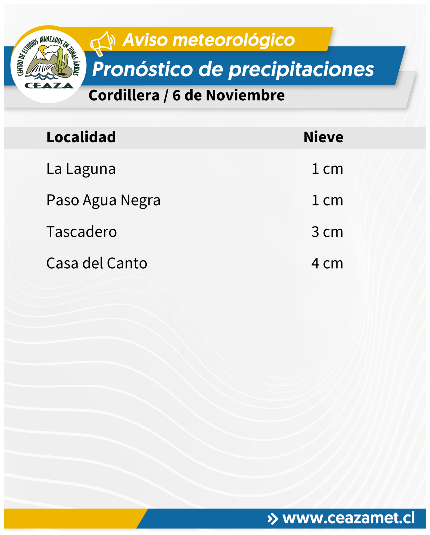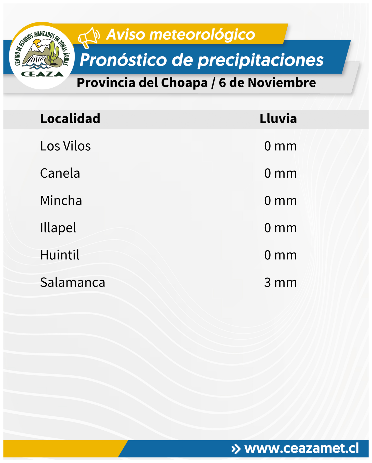 Según el meteorólogo de CEAZA, Tomás Caballero, “se pronostican chubascos para el día jueves 6 de noviembre en la Región de Coquimbo, los cuales podrían estar acompañados de tormentas eléctricas en sectores cordilleranos. En toda la región podrían registrarse chubascos débiles, concentrándose las precipitaciones más significativas en zonas interiores y de cordillera, con montos entre 1 y 3 mm en Pisco Elqui, Hurtado, Combarbalá y Salamanca. En sectores cordilleranos se esperan nevadas con acumulados de hasta 4 cm”.