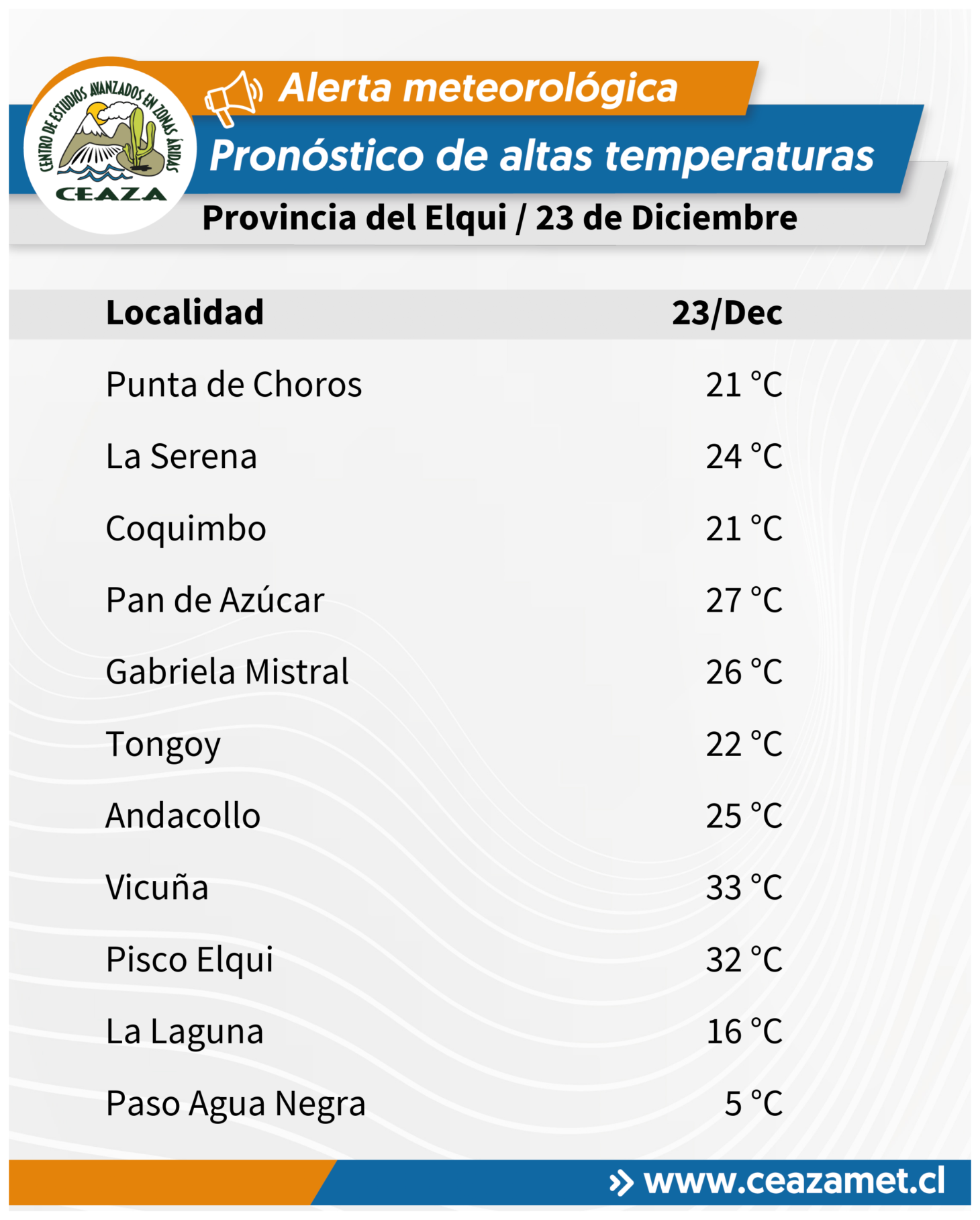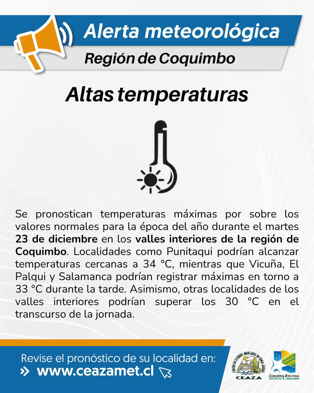 De acuerdo al meteorólogo de CEAZA, Tomás Caballero, para mañana martes 23 de diciembre “se pronostican temperaturas máximas por sobre los valores normales para la época del año durante el martes 23 de diciembre en los valles interiores de la región de Coquimbo. En este contexto, localidades como Punitaqui podrían alcanzar temperaturas cercanas a 34 °C, mientras que Vicuña, El Palqui y Salamanca podrían registrar máximas en torno a 33 °C durante la tarde. Asimismo, otras localidades de los valles interiores podrían superar los 30 °C en el transcurso de la jornada”.