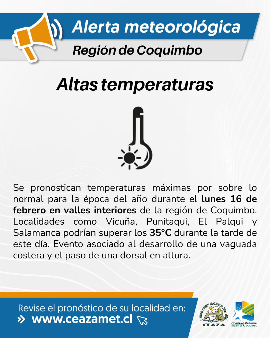 El meteorólogo de CEAZA, Tomás Caballero, detalló que “se pronostican temperaturas máximas por sobre lo normal para la época del año durante el lunes 16 de febrero en valles interiores de la región de Coquimbo. Localidades como Vicuña, Punitaqui, El Palqui y Salamanca podrían superar los 35°C durante la tarde de este día”.