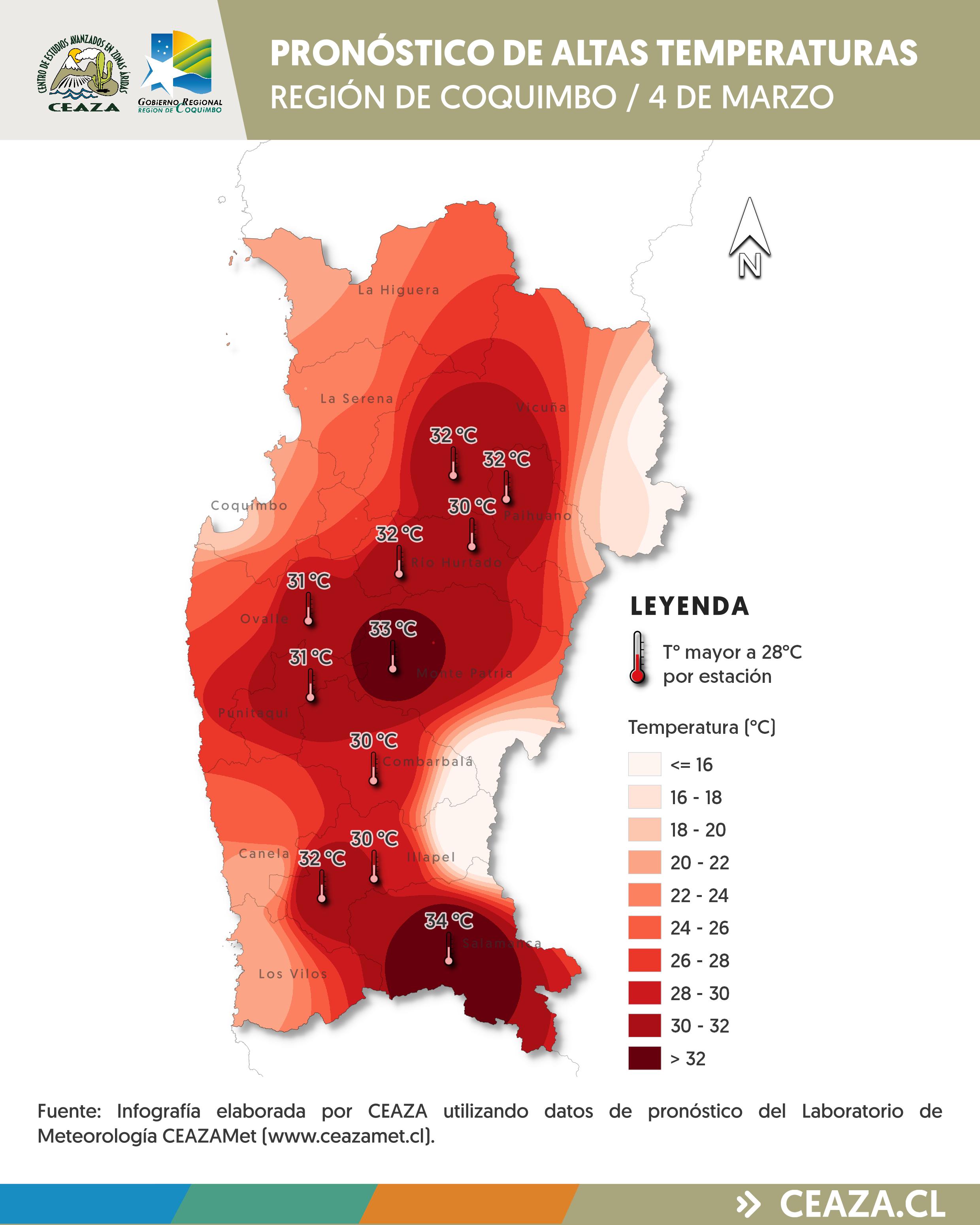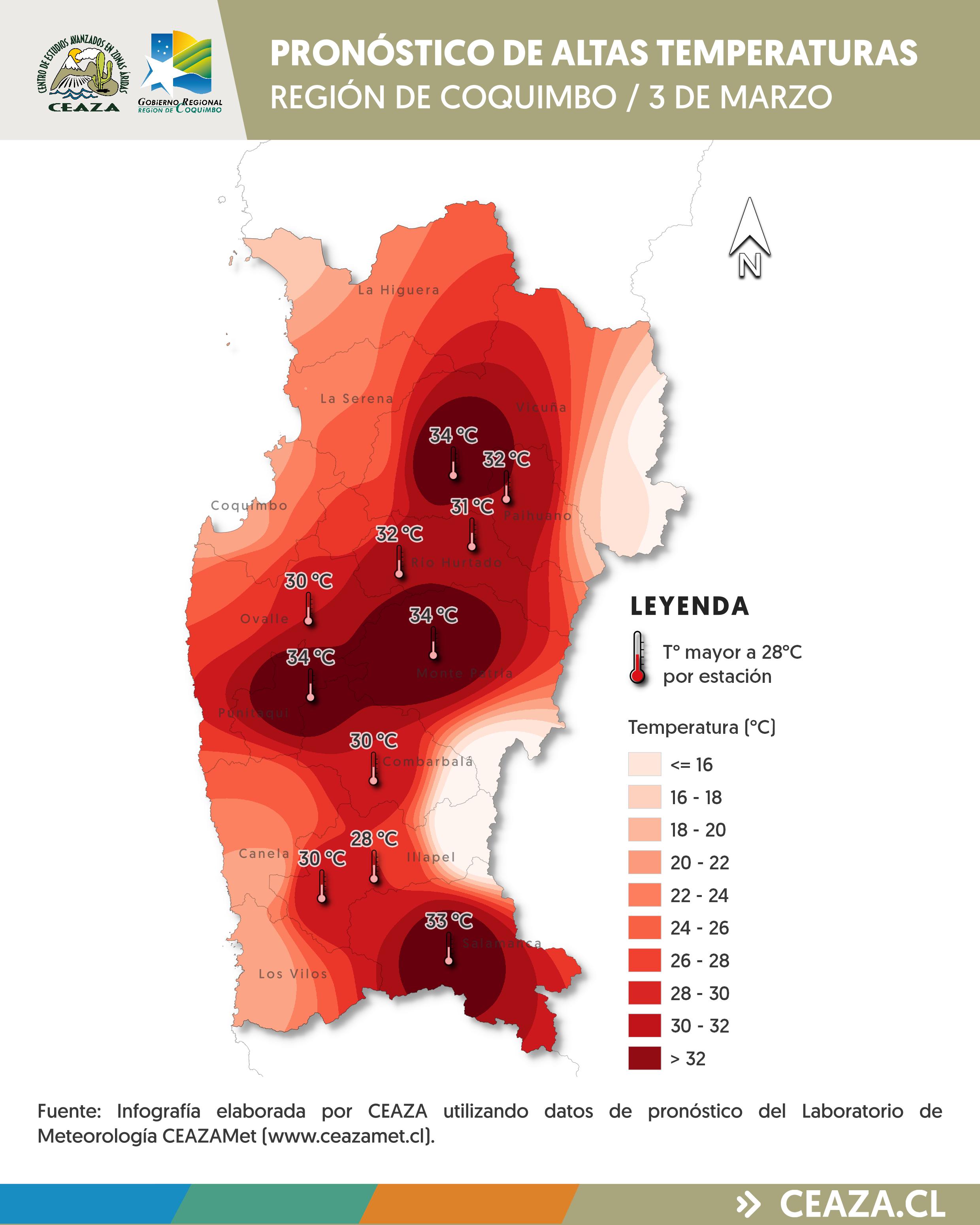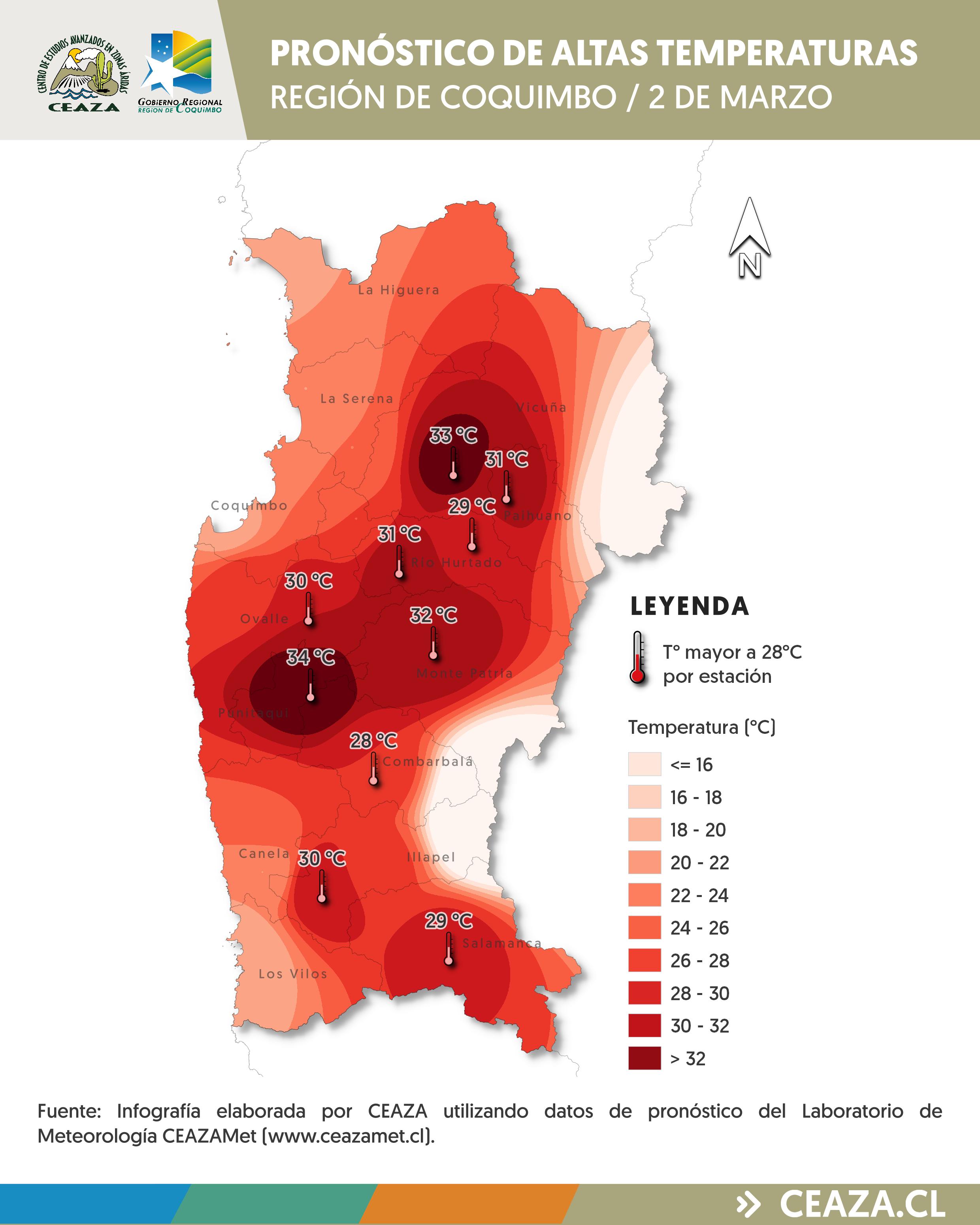 Se pronostican temperaturas máximas por sobre lo normal para la época del año entre los días 2 y 4 de marzo en los valles interiores de la Región de Coquimbo. “Durante este período, las temperaturas superarán los 30 °C en la mayoría de las localidades interiores, pudiendo alcanzar valores cercanos a los 34 °C en horas de la tarde, especialmente en sectores como Vicuña, Punitaqui, Rapel y Salamanca”, detalla el meteorólogo de CEAZA, Tomás Caballero.