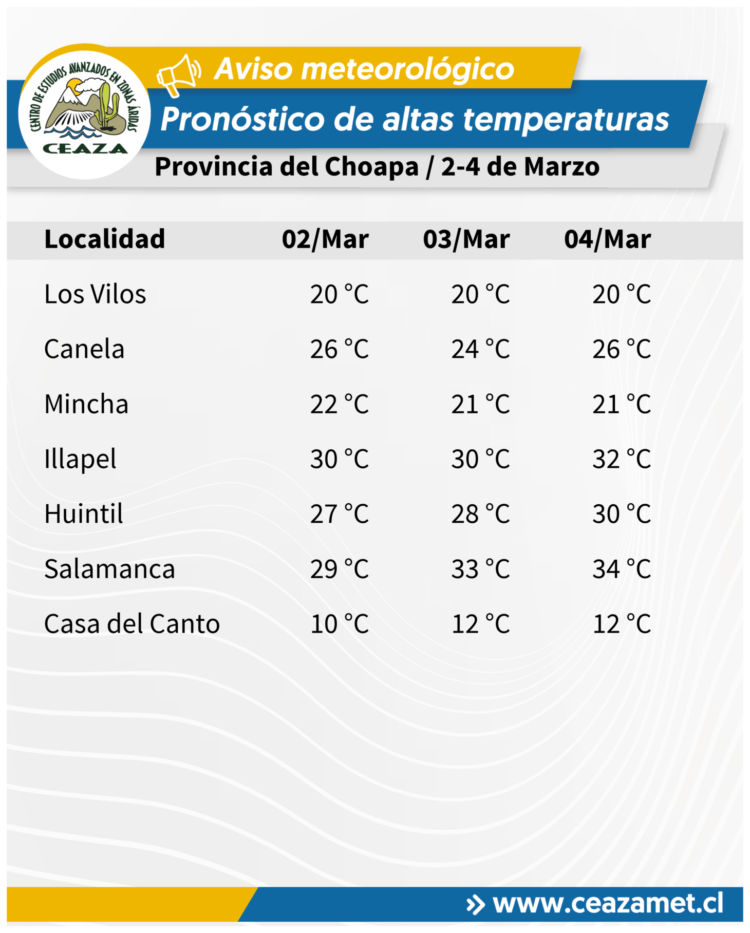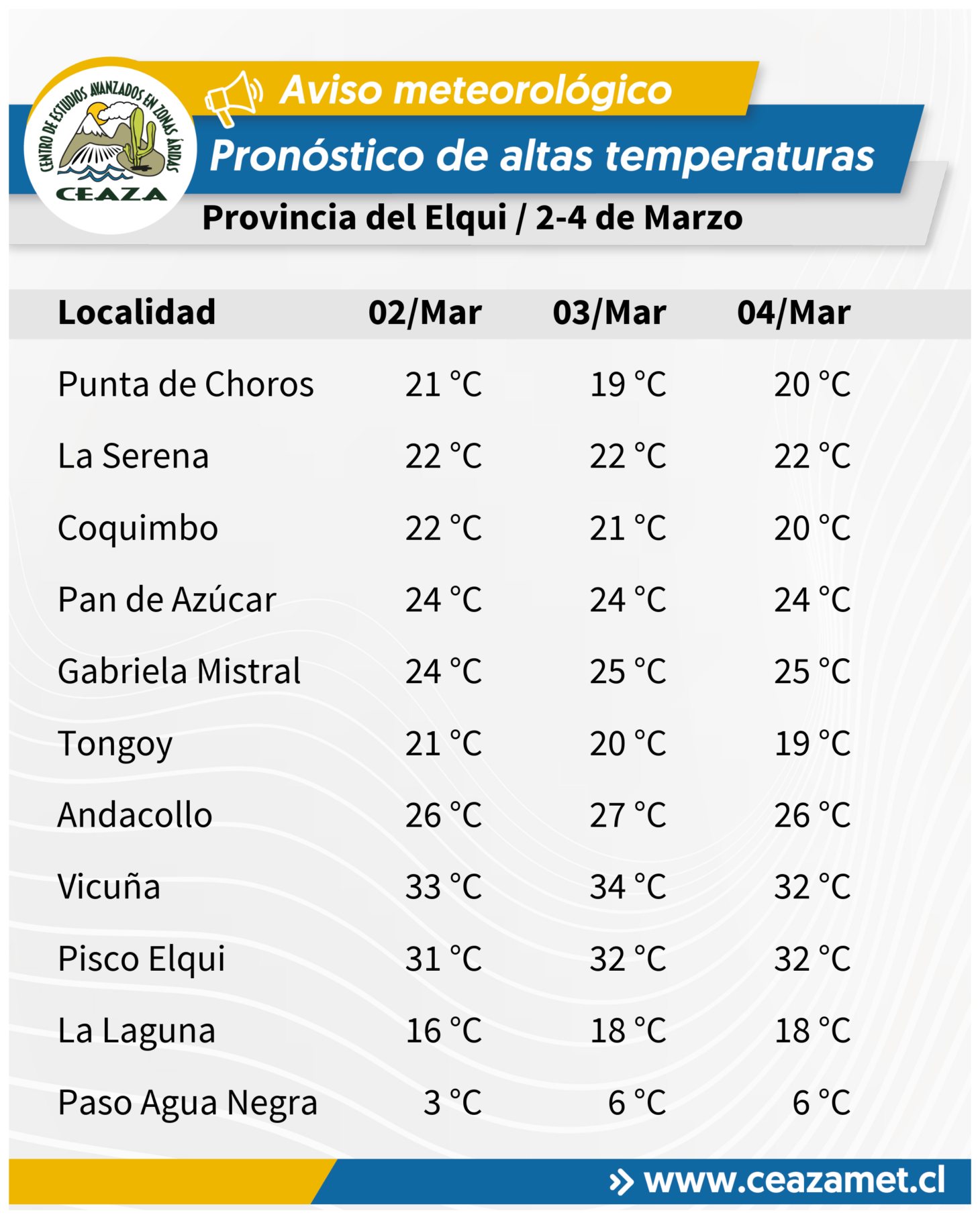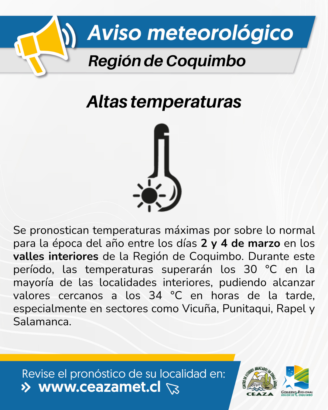 Se pronostican temperaturas máximas por sobre lo normal para la época del año entre los días 2 y 4 de marzo en los valles interiores de la Región de Coquimbo. “Durante este período, las temperaturas superarán los 30 °C en la mayoría de las localidades interiores, pudiendo alcanzar valores cercanos a los 34 °C en horas de la tarde, especialmente en sectores como Vicuña, Punitaqui, Rapel y Salamanca”, detalla el meteorólogo de CEAZA, Tomás Caballero.