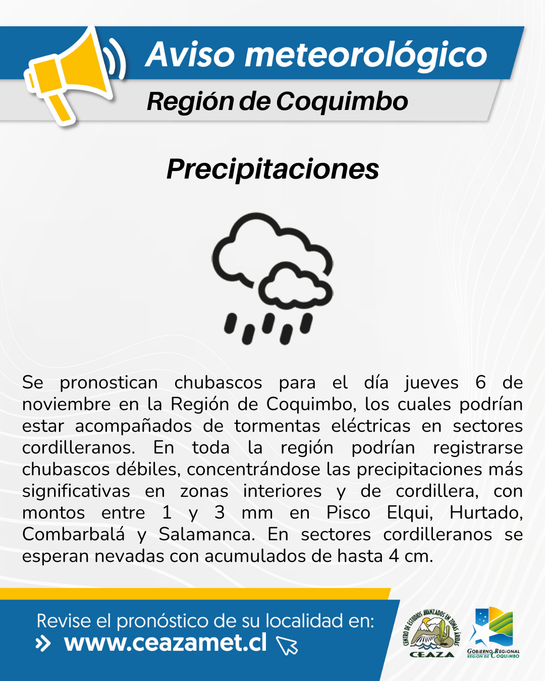 Se recomienda tomar las precauciones pertinentes y estar atentos a la evolución del pronóstico en la página www.ceazamet.cl